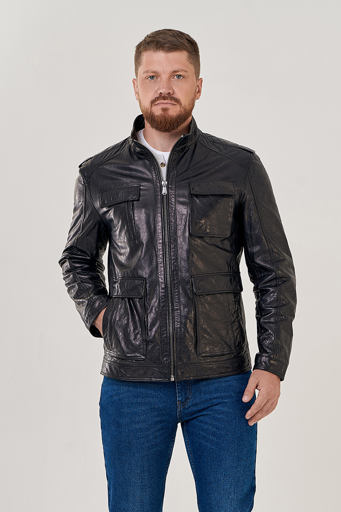 Кожаная куртка черного цвета. Модель дополнена карманами. Центральная застежка на молнию. Базовая модель, подходит для работы и прогулок. Воротник стойка защитит от ветра. Удобная длина изделия позволяет с комфортом гулять, работать и водить машину. Прямой фасон не будет сковывать движений.