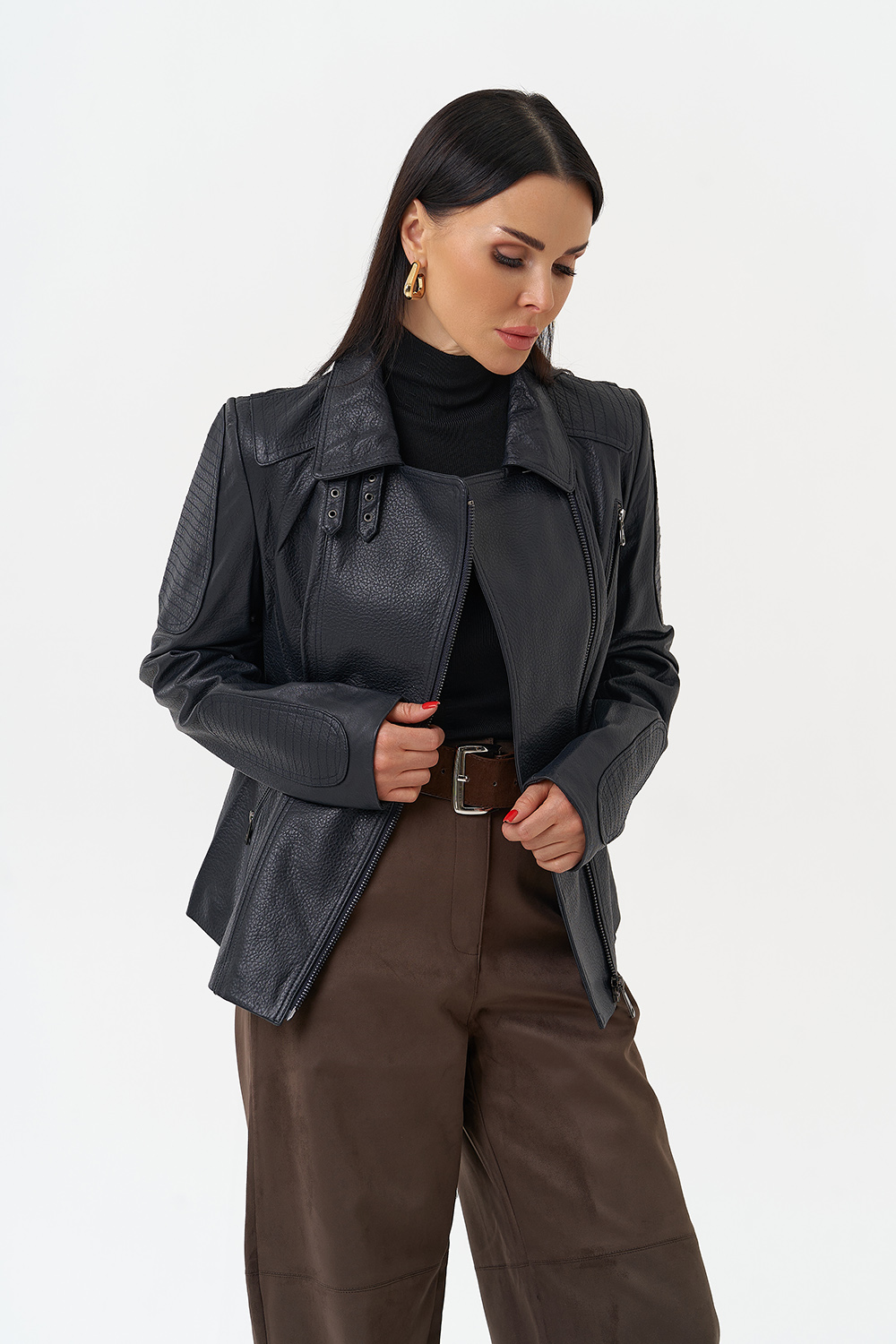 Длина изделия - 60 см;Длина рукава - полный;Цвет -синий;Материал - натуральная кожа;Фасон - приталенный;Вид застежки - молния;Вид ворота - стойка