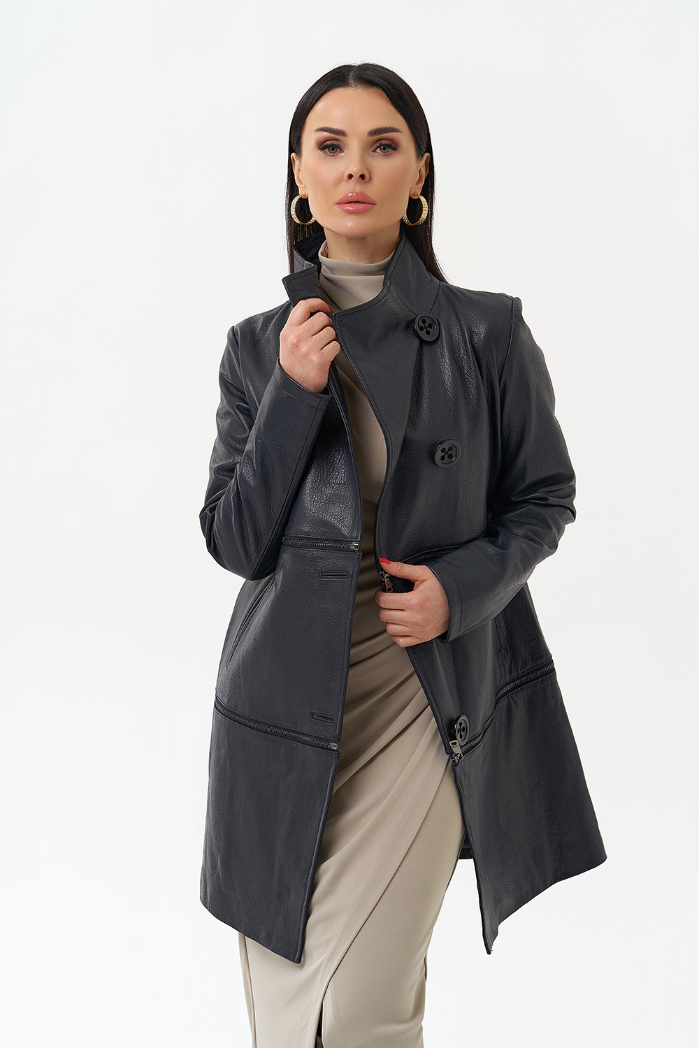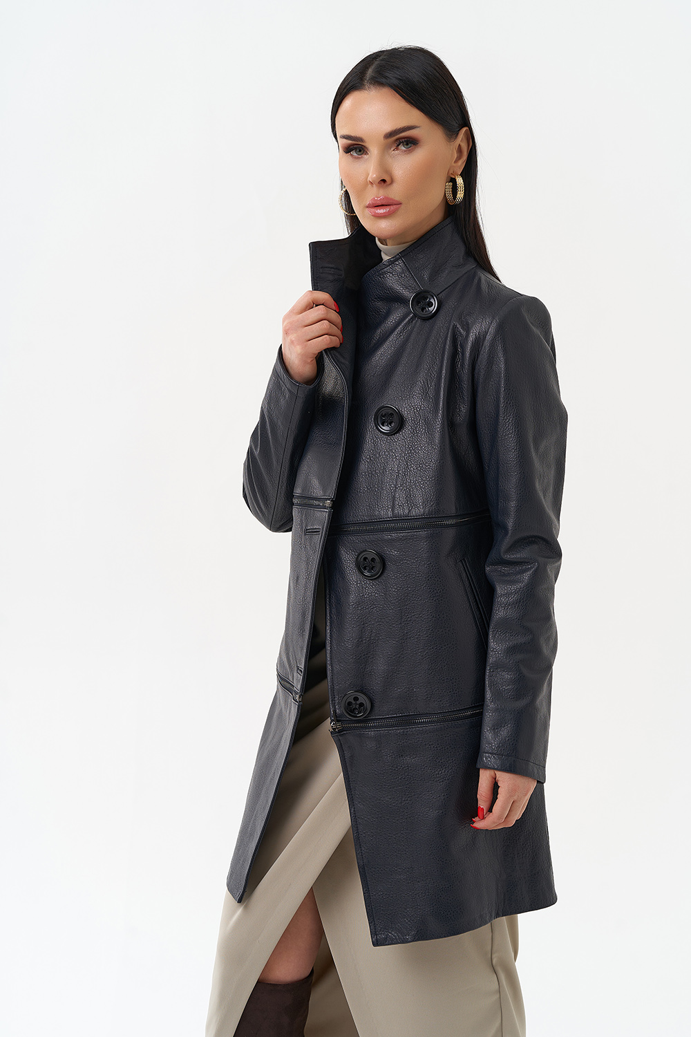 Плащ-трансформер из натуральной бараньей кожи в синем цвете в полуприлегающем фасоне. Подойдет для тех, кто любит перемены! Данное изделие можно носить в трех вариациях: укороченная кожаная куртка, классическая кожаная куртка и плащ. Акцентными деталями этой модели является ворот-стойка и большие пуговицы. Прочная и износостойкая кожа даст возможность сохранить ваше изделие на долгие годы, а количество вариаций образов с данной моделью позволит вам всегда оставаться в тренде.