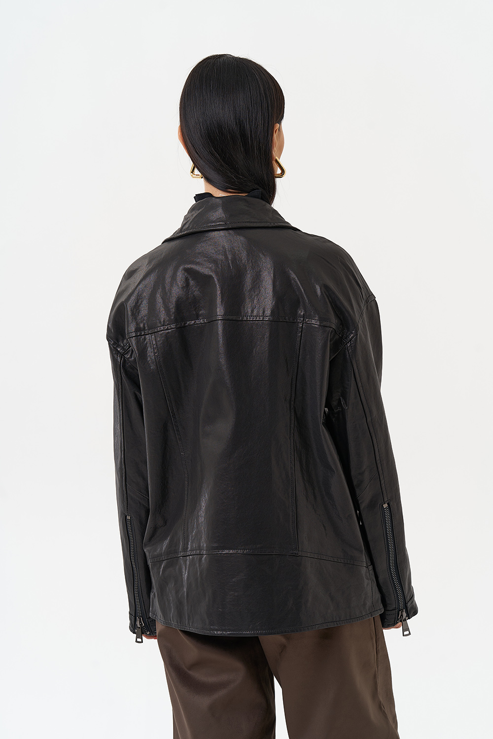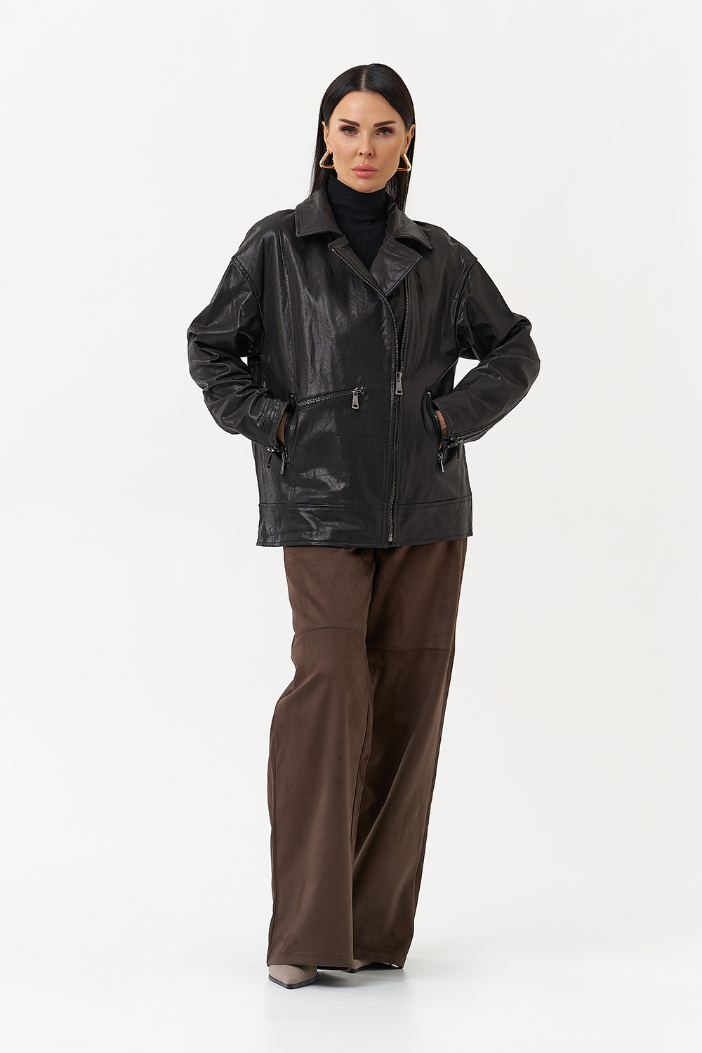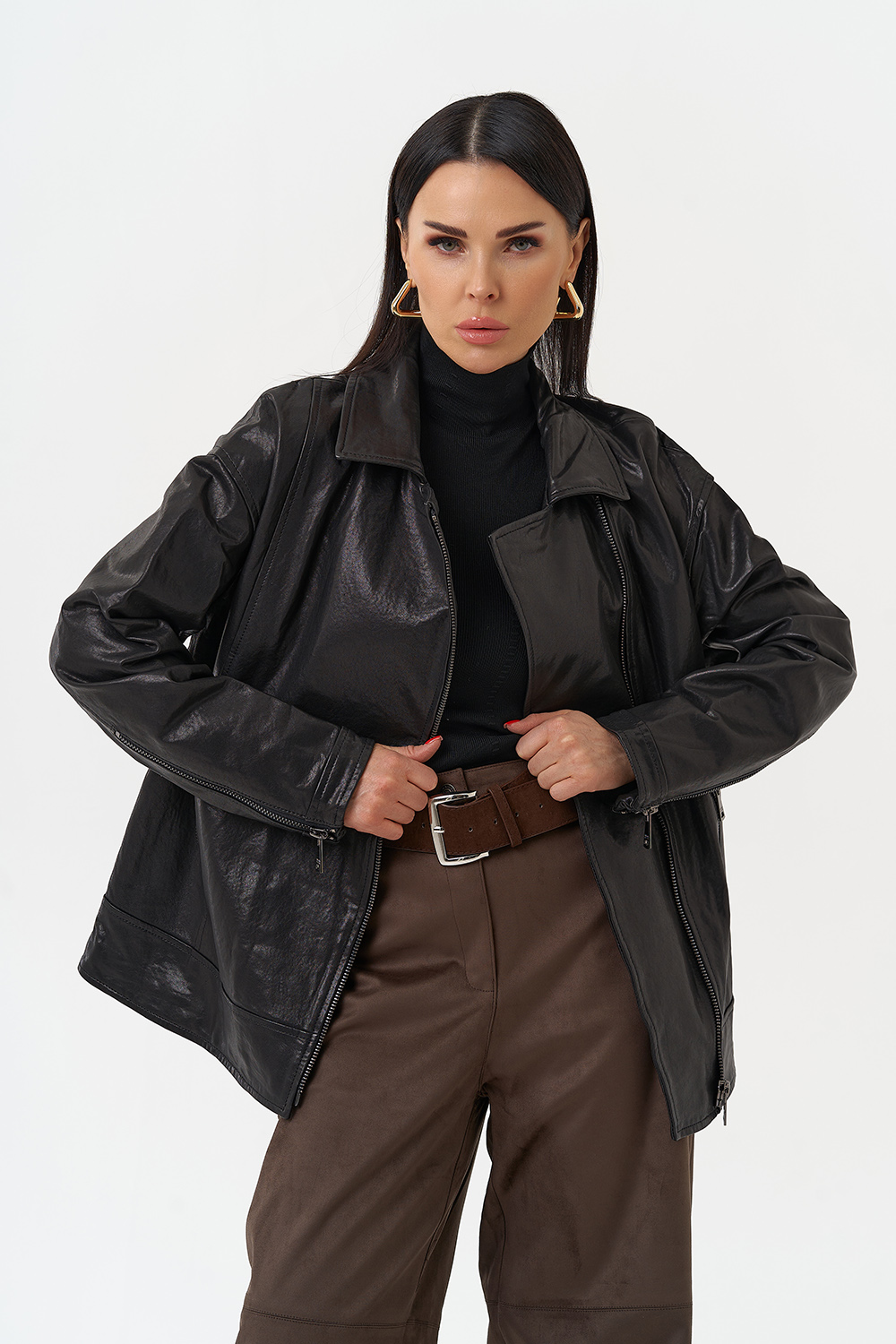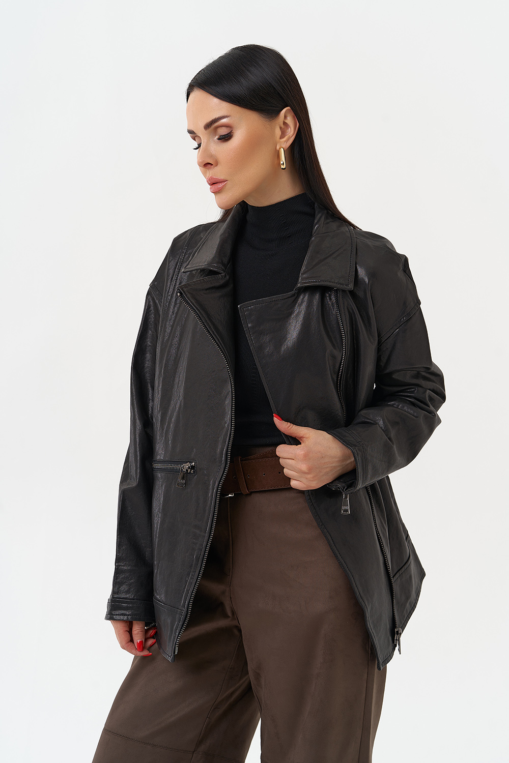 Женская косуха из натуральной кожи в черном цвете - универсальная модель, которая не сдает позиций с 1970-го года! В этом сезоне в трендовом оверсайз- фасоне. Он подойдет всем типам фигуры и будет хорошо смотреться с любым образом, а если вы хотите выделиться, то наденьте ее с легким платьем. Косуха дополнена отложным воротником и молнией. Если вы ищете куртку, которая будет вне времени и будет сочетается с любой одеждой, то это то, что вы искали.