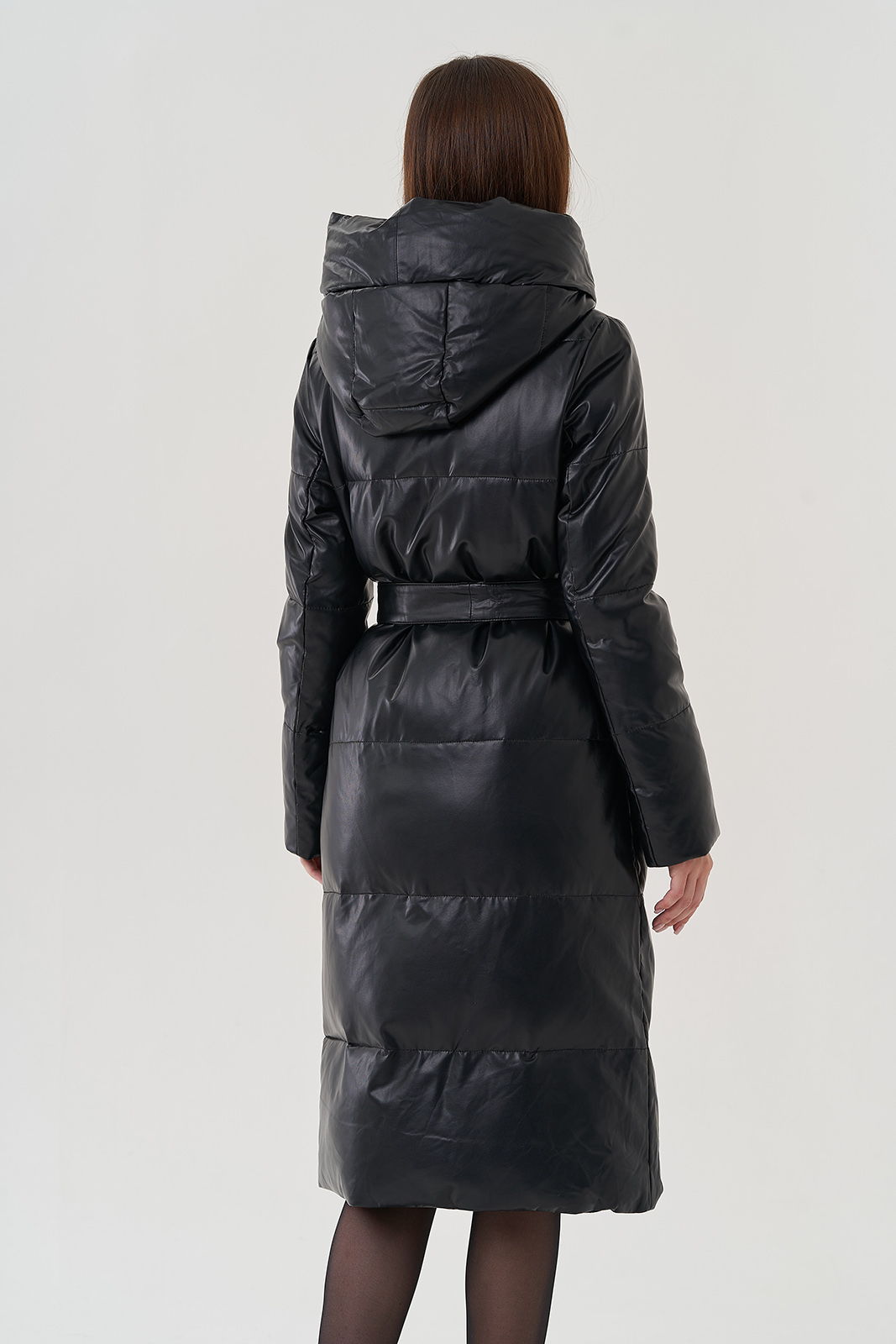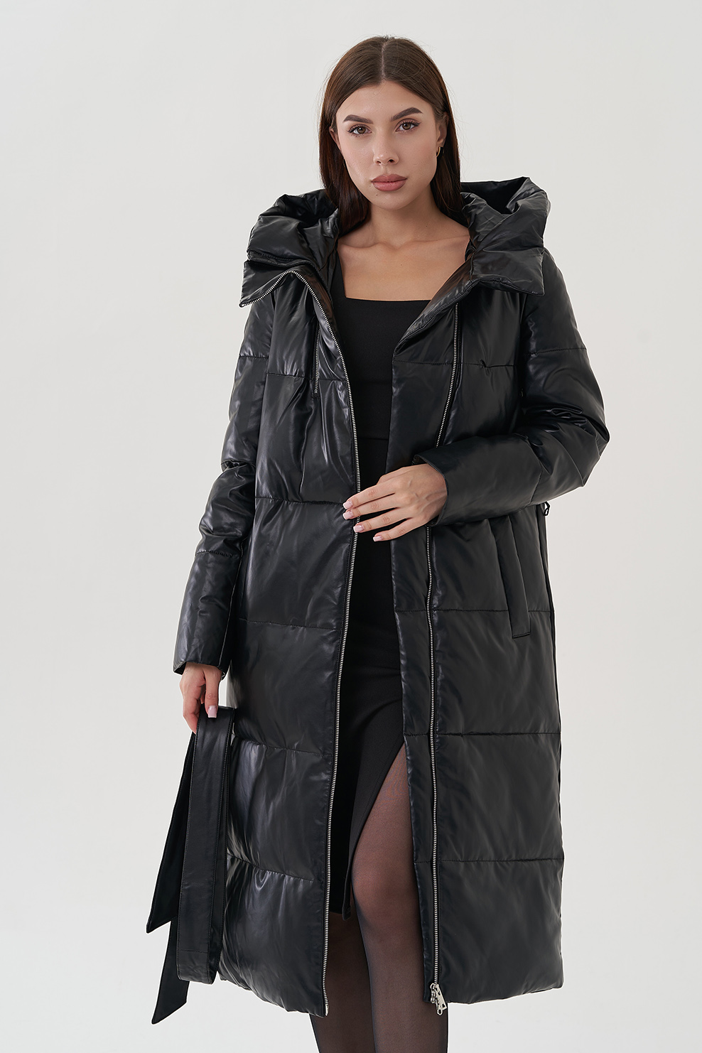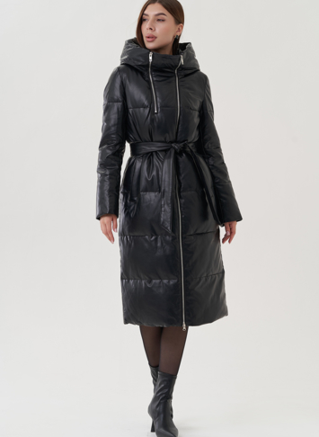 Женский пуховик из эко кожи с капюшоном (чёрный)