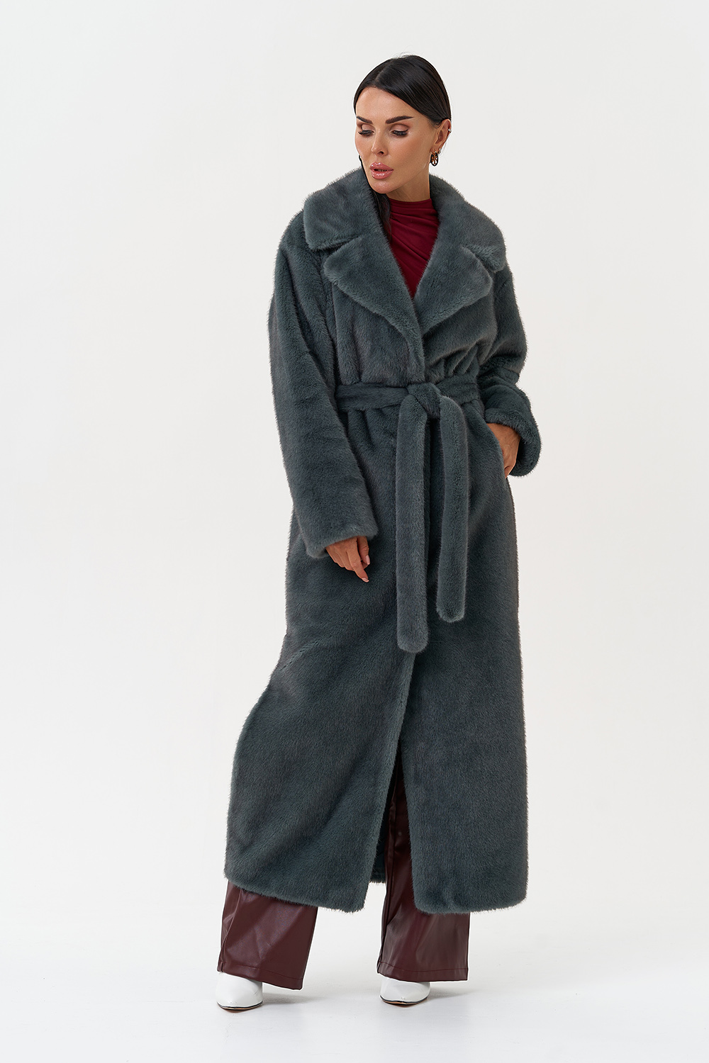 Фасон - прямой Длина изделия - 130 см Цвет - зеленый (ментол) Материал - экомех Состав полотна - полиэстер 100% Подкладка - полиэстер 100% Вид застежки -крючки, пояс Вид ворота - английский воротник Фасон рукава - втачной, длинный |